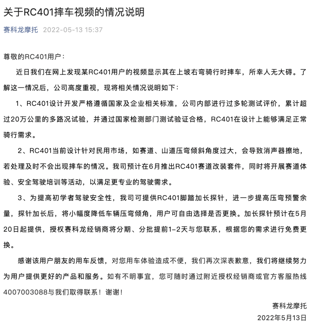 宗申赛科龙新款跑车RC401近期因为跑山摔车一事,似乎又被推上了风口浪尖,今天宗申官方对于此事也做出了回应,先来看看官方的回复: