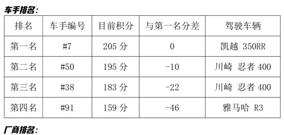 虽然现在凯越的7号费尔南德斯手握10分的优势领先,但是周末的这两场正赛一共有最多50分的积分可以拿,所以最终结果仍旧充满悬念!如果7号能保住第一名,这可能将是中国制造的赛车在世界级比赛上的第一个年度总冠军! Tips:凯越只有一台赛车孤军奋战,每场比赛需要面临川崎(15辆)雅马哈(12辆)两家车手的围剿,尤其是川崎的两名车手积分很接近,这对凯越来说很不占优势。