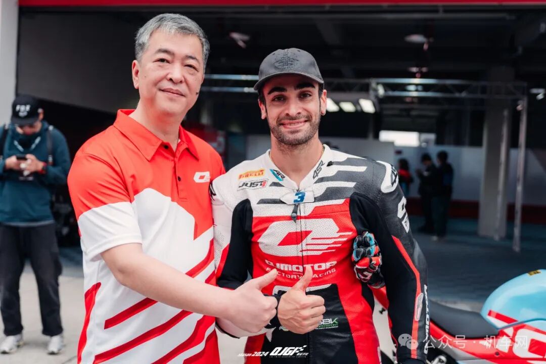 钱江摩托总经理郭东劭先生、QJMOTOR的WSBK赛事合作方意大利Puccetti Racing车队经理和为QJ厂队担任车手的拉斐尔.德罗萨Raffaele de rosa上台致辞。