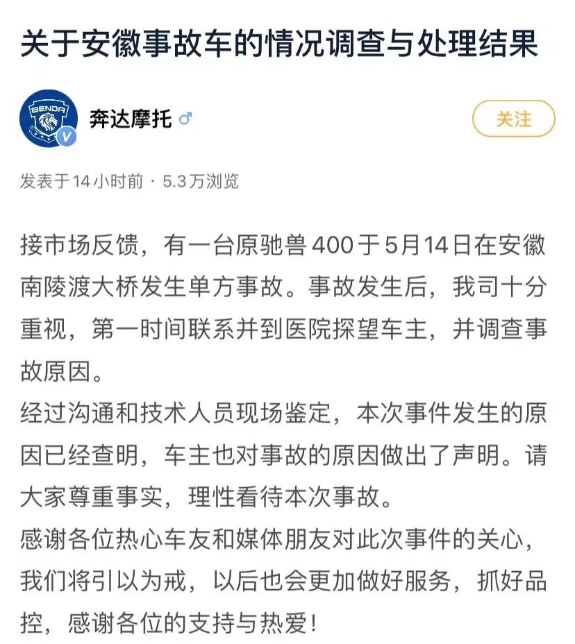 奔达这次的事故处理不可谓不快,也是符合他们售后的一贯作风,在昨晚加急处理的调查结果中,也显示出了官方首次公告中对车主没有的关心。
