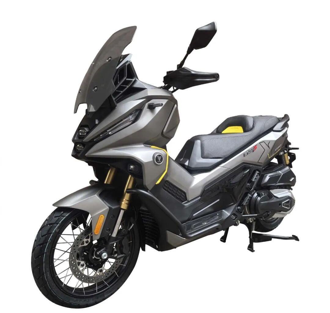 双缸ADV踏板SR450,有一大波兄弟在等这个车上市,自研398cc双缸发动机,42匹马力,1525mm轴距,极速139km/h,前17后14辐条轮,带独立越野脚踏,就是这210kg体重着实不轻,而且没有用上链条传动。