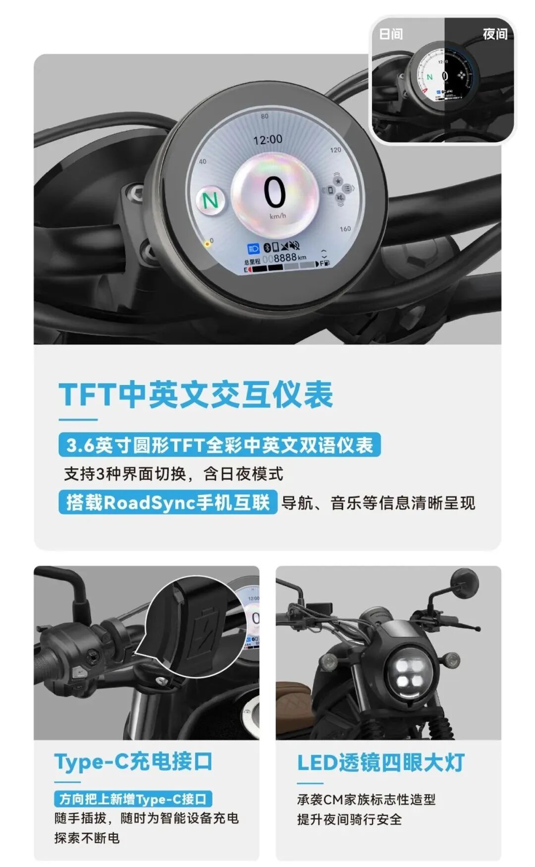 这次更新了带手机投屏功能的3.6寸TFT仪表,充电C口,透镜大灯,并且为了照顾小个子骑手将手把后拉下移。