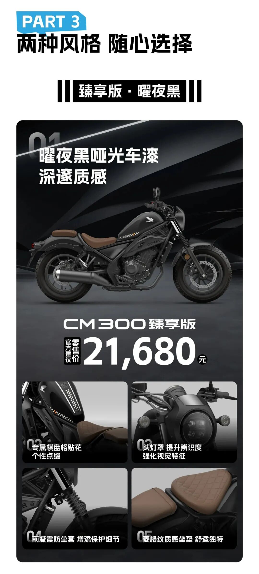 臻享版自带“改件”,基础配置相同,配色只有耀夜黑,油箱增加棋盘格涂装,座垫颜色改为棕色菱形格,增加大灯罩,前避震防尘套。
