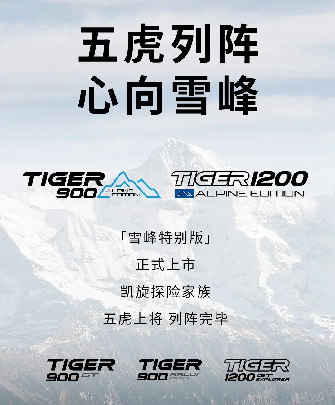 就在昨天,凯旋Tiger系列发布雪峰版,这个消息我们前几天已经报道过了原厂天蝎,全系雷达,凯旋发布特别版老虎900和1200,感叹凯旋跟进全球车款的速度是真快!