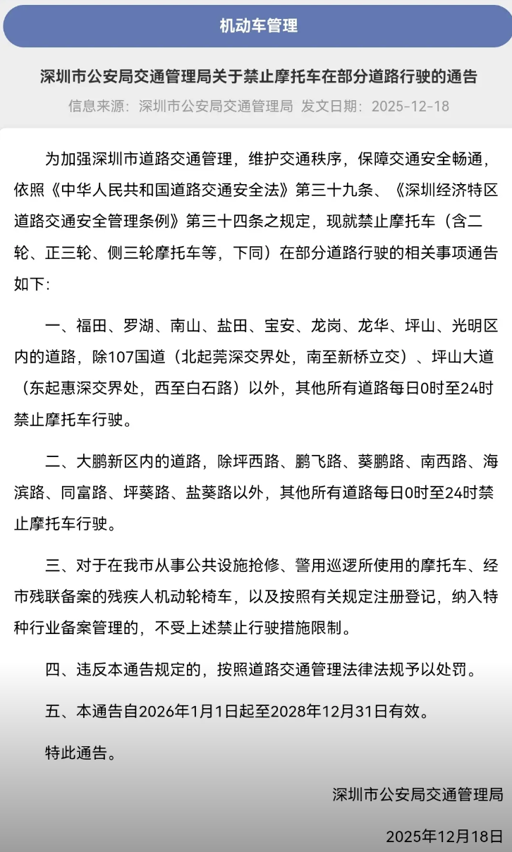 兄弟们,刚刚深圳交警正式官宣,禁摩令直接续期3年,从2026年1月1日续到2028年12月31日,核心管控规则没变化,还是熟悉的管理配方,只把期限又拉长了三年。Tips:深圳核心区域禁摩自2008年起已多次续期,上一轮期限至2025年12月31日。