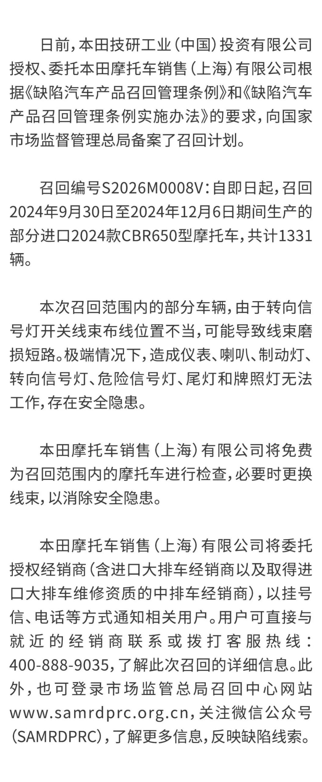 2026年2月5日,本田召回2024年9月30日至2024年12月6日期间生产的部分进口2024款CBR650型摩托车,共计1331辆,手里有这台车的兄弟得查一下生产日期了。