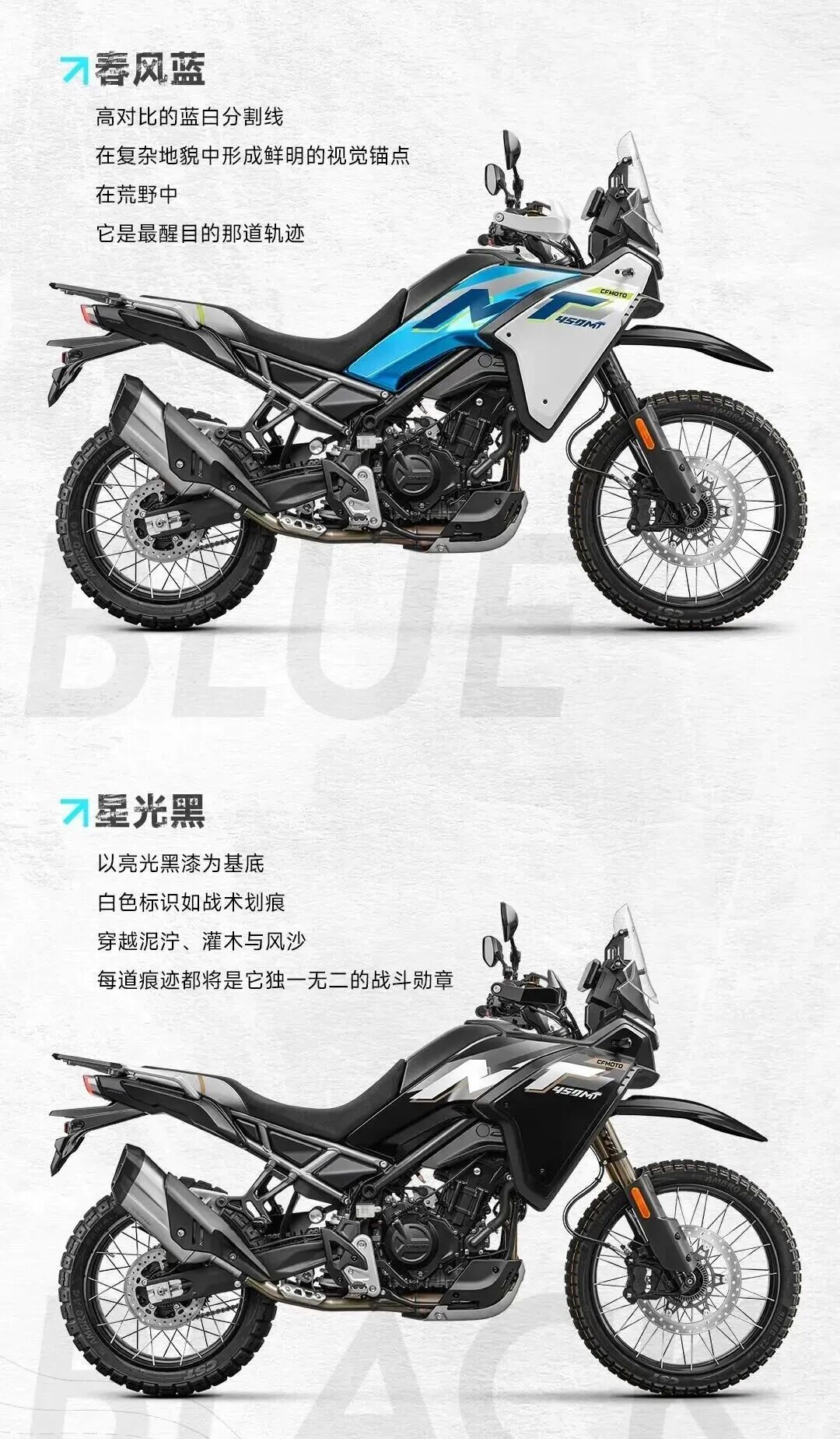 新款有两个版画,春风蓝,星光黑,还是有高位、低位前挡泥板可选。这次增加一个降低座垫,之前只有增高,这次座高最低能降到800mm,最高870mm,450MT可能是最想让更多驾驶员骑上的硬派拉力车。