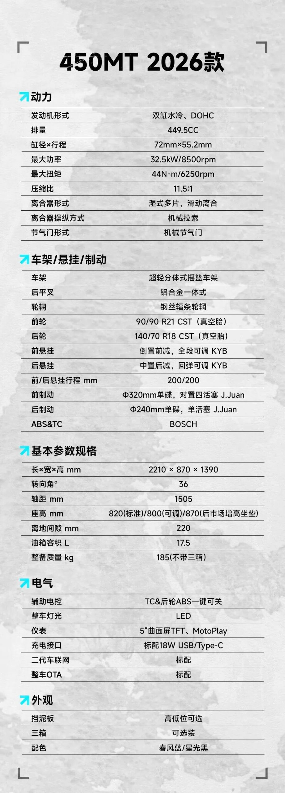 近日,春风公布了2026款450MT,这台车期待值着实高,有的兄弟猜测会扩缸到550cc,有的猜会上电子油门,都没有,变动的只有版画还有一个降低座垫,这波是国际春。