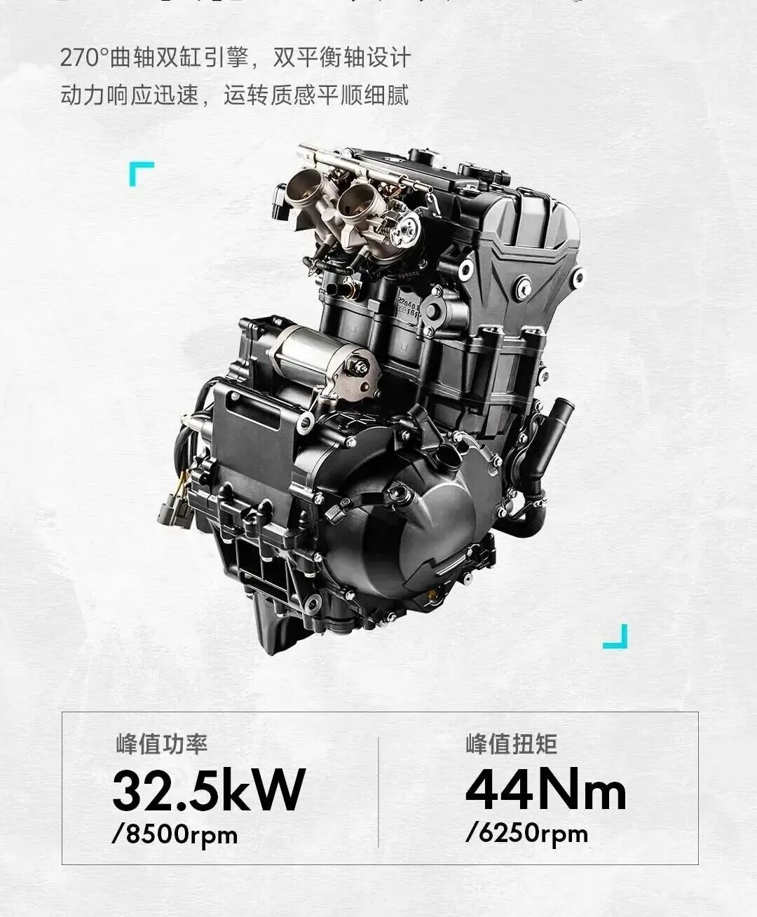 发动机不变,还是449cc双缸机,双平衡轴+270°曲轴,8500转输出最大功率32.5KW,6250转爆发最大扭矩44牛米,震动小,声浪好听。