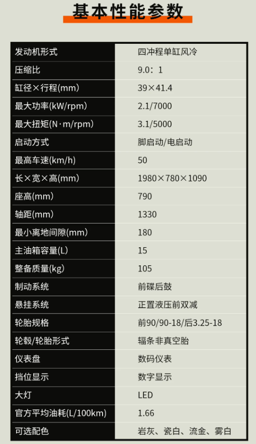 四冲程单缸风冷发动机,实际排量49cc,压缩比9:1,最大功率2.1kw,在7000转爆发,最大扭矩3.1N.m在5000转爆发,看到这个数据只能说油门焊不焊死不重要了