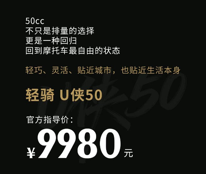 最近轻骑发布了一款50cc的跨骑车型 -U侠50,售价9980元,按照目前的这个市场行情,价格好像也不是特别便宜,但是稀缺性倒还是有的。
