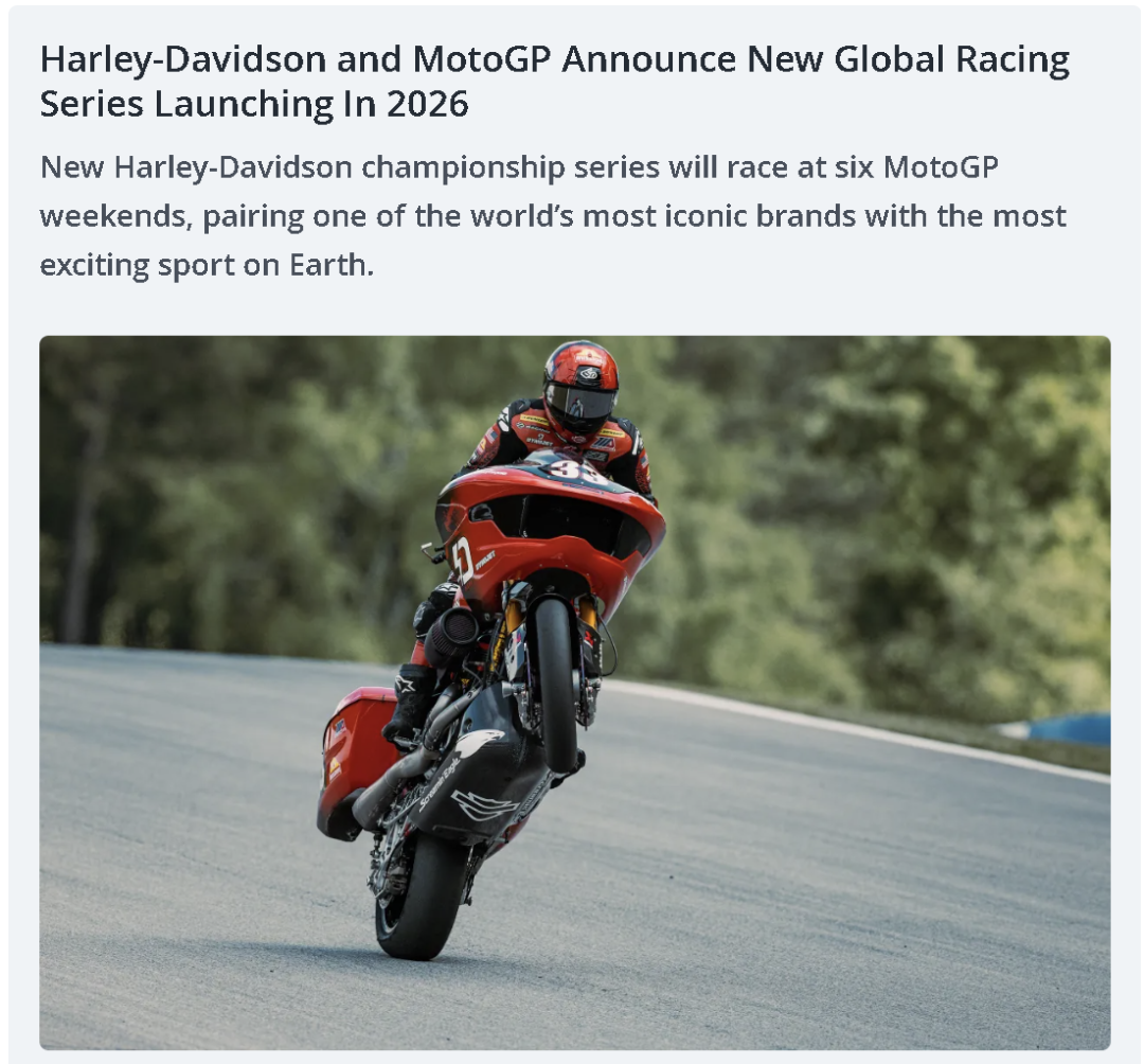 MotoGP和哈雷正式宣布了2026年的新“边箱之王”系列赛事计划,包括六轮赛程的具体地点和日期,每轮两场比赛。并正式命名为“Harley-Davidson Bagger World Cup”,这系列比赛会在2026赛季MotoGP世界锦标赛的正赛周末举行。