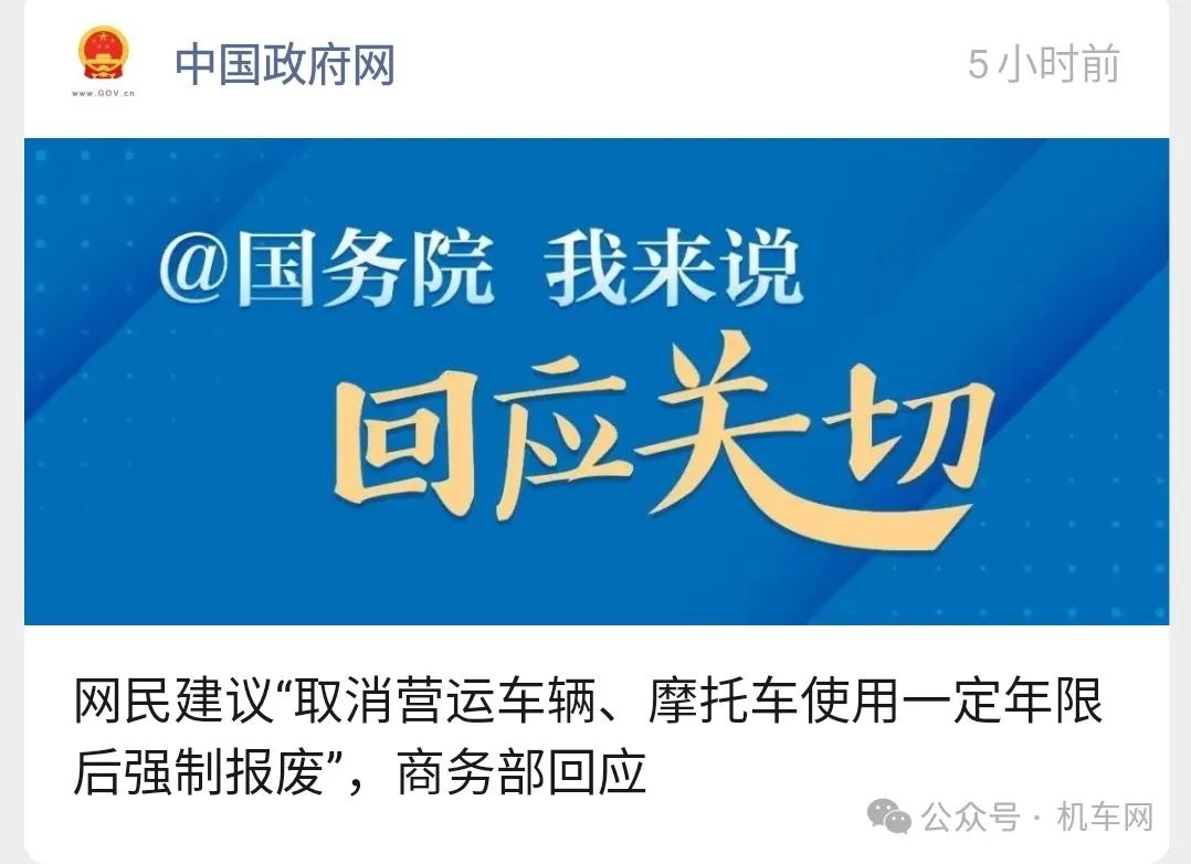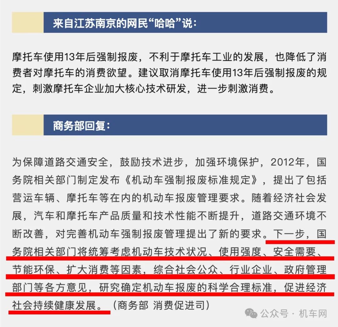 从商务部的回应可以发现,虽然没有明确表示要取消或延长摩托车13年报废,但官方也是有这个意向的。最重要的是,这不是民间动作,而是官方首次正式表态要推进这件事情。