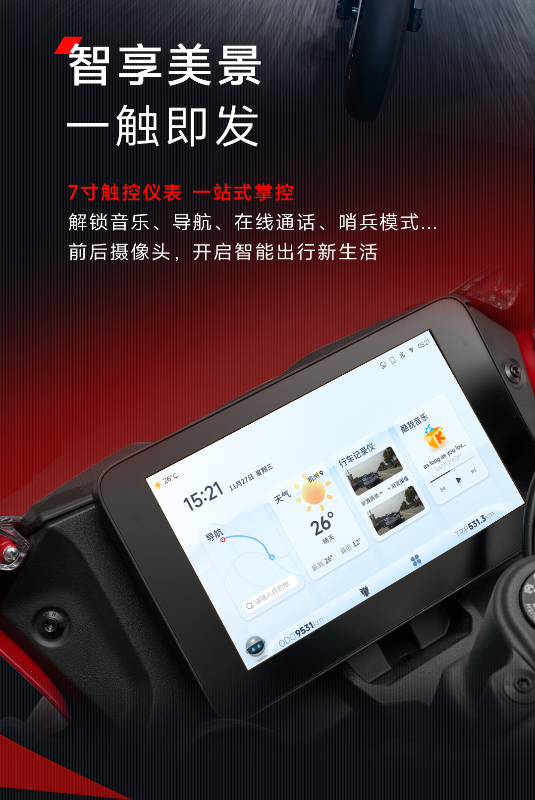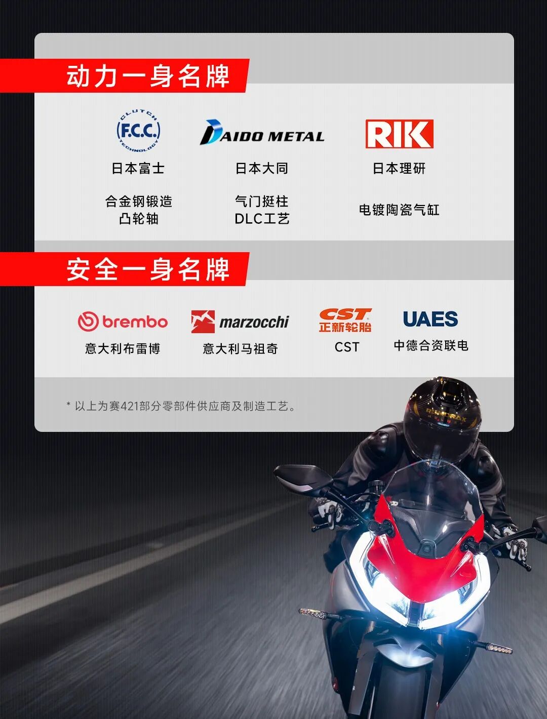 赛421整备质量仅176kg其中包括16L大油箱,坐高仅808mm,轴距1375mm;搭载7英寸TFT触屏仪表,内嵌前后摄像头画面,手机互联,ParaPal智能系统骑行中可以语音控制,对新手用户十分友好